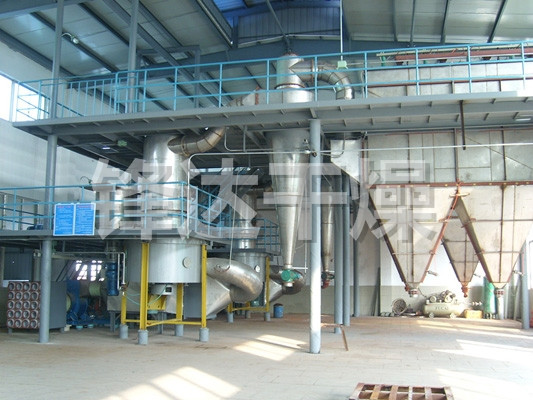 热空气切线进入干燥器底部,在搅拌器带动下形成强有力的旋转风场。膏状物料由螺旋加料器进入干燥器内,在高速旋转搅拌桨的强烈作用下,物料受撞击、磨擦及剪切力的作用下得到分散,块状物料迅速粉碎,与热空气充分接触、受热、干燥。脱水后的干物料随热气流上升,分级环将大颗粒截留,小颗粒从环中心排出干燥器外,由旋风分离器和除尘器回收,未干透或大块物料受离心力作用甩向器壁,重新落到底部被粉碎干燥。