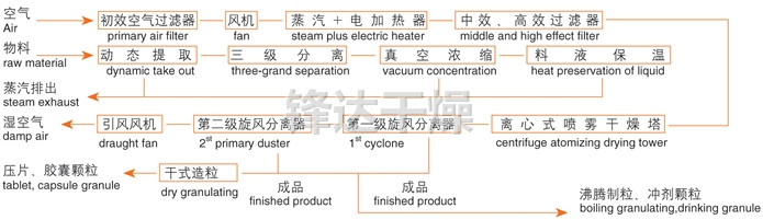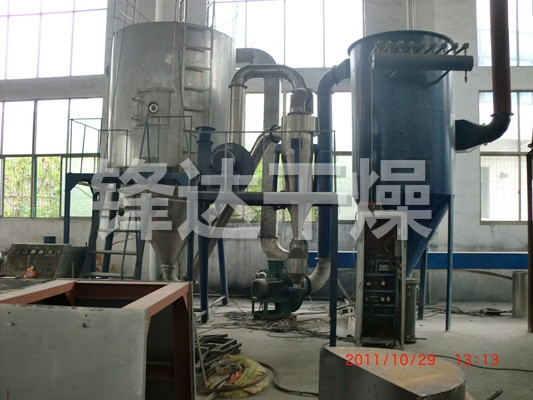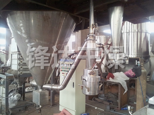 该机采用全封闭形式,所有部件均采用不锈钢制造,配有三级净化装置,过滤后的空气达十万级要求。筒体与顶部装有冷壁装置,使壁温<80℃,干燥塔内装有气刷扫塔装置。经该机干燥后的浸膏粉,不会出现焦化变质现象,大大增加了收粉率(95%以上),而且不会产生混料现象和粘壁现象。