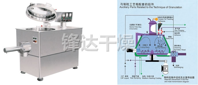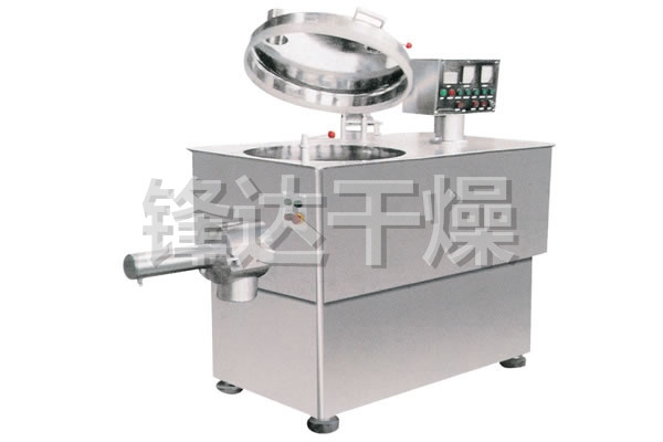 粉体物料与粘合剂在圆筒形容器中由底部混合浆充分混合成湿润软材,然后由侧置的高速粉碎桨切割成均匀的湿颗粒。