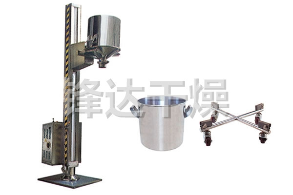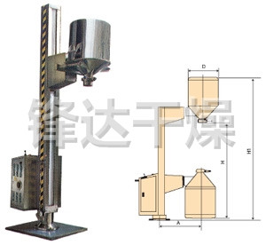 TJG 系列固定提升加料机由两部分组成,即提升机及底座。提升机由机架、液压提升系统及料门翻转机构组成。工作时,先将提升机的料门与料桶扣合,启动提升操作杆,料门与料桶一起上升,启动翻转操作杆,料桶即可番转180度,呈底桶向上姿态并移动到所需位置,利用料门上出料蝶阀,可很容易将物料加入所需的工艺设备中。