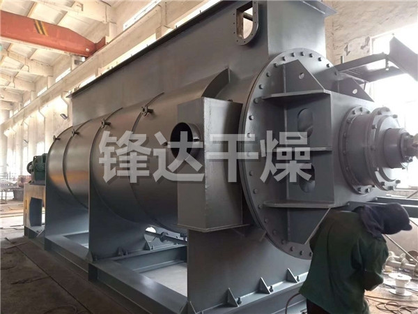 干燥设备相比具有,传热面积大,搅拌效果好,更能促进水分的蒸发和去除等优点,是新开发的一款改良型简接加热干燥机。转盘式干燥机主要是由定子(外壳),转子(转盘)和驱动装置组成。转子中心轴是干化转盘的承载部件,它是一个中空轴,所有的转盘焊接在这个空轴上。圆盘干燥机通过转盘边缘的推进/搅拌器的作用,污泥被均匀缓慢地输送通过整个干燥机,并通过与转盘的热接触被干化。在干化过程中,热蒸汽冷凝在转盘腔的内壁上,形成冷凝水。冷凝水通过一个管子被导入中心管,^终通过导出槽导出干燥机。在每两片转盘之间装有刮刀,刮刀固定在外壳(定子)上。刮刀可以疏松盘片间的污泥,使废蒸汽快速离开污泥。干燥机的传热介质一般是0.2Mpa~0.6Mpa的饱和蒸汽。圆盘式干燥机每片转盘由两个对扣的圆盘焊接而成。中心轴内腔与所有转盘内腔相连通。为了提高转盘的坚固性,空心转盘内腔分部着许多支撑杆,支撑杆两端支撑着左右两个圆盘。根据所干化物料性质的不同,转盘可以采用低碳钢,不锈钢,或特殊合金钢制造。在转盘边缘装有推进/搅拌器,它们有两个功能:一是推进输送物料,二是搅拌混合物料。推进器的倾角是可以调整的,转盘的内腔可以通入中低压蒸汽,导热油或高压热水传递干化产品所需热量。