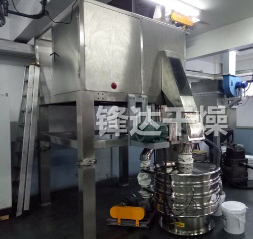◆混合后的前驱体粉末通过买方的变频关风机均匀地送入预脱气料仓,脱气料仓将物料预脱气后压入强制喂料机,强制喂料机强制给压辊喂料,经过压辊挤压物料后成片,再通过破碎系统将片状物料初步破碎,形成颗粒与粉末的混合物,最后筛分机筛分出成品颗粒,小于成品要求的颗粒和细粉重新回到系统里循环制粒